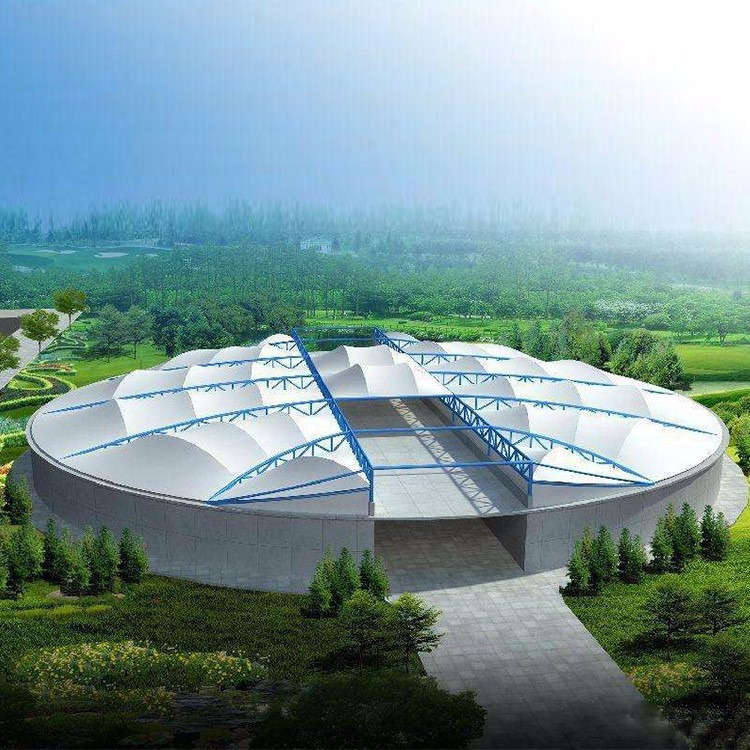 3.自洁性好,安装便捷。污水池反吊膜加盖封闭所用膜材表面具有防污涂层,表面不易沾染脏物及灰尘,仅靠雨水的冲刷即可长久保持洁净。安装非常便捷,减少了对场地的占用,尤其是旧池体封闭改造项目中可采取膜结构整体吊装,不影响池体内部的设备运转。