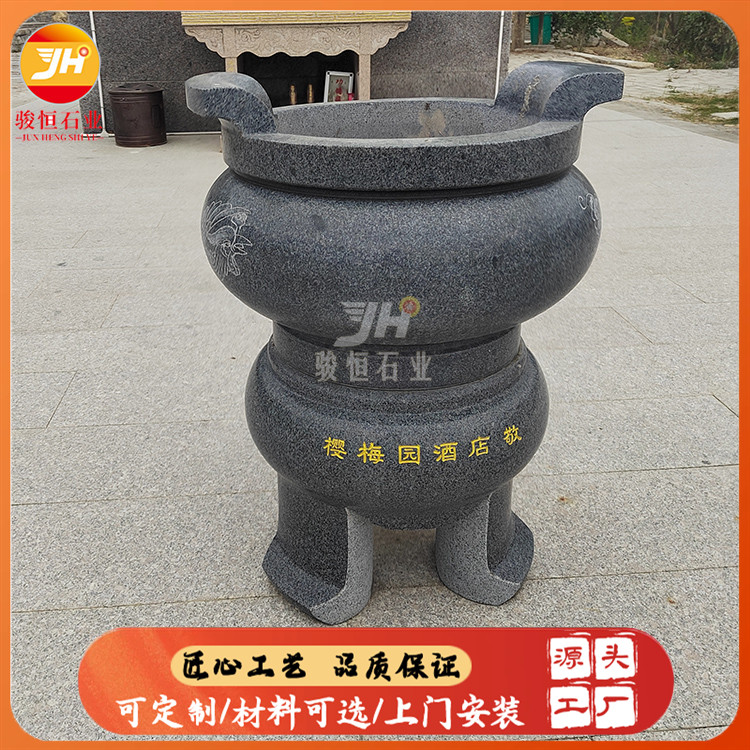 石雕香炉,佛教中称它宝鼎,除了方形的香炉外;圆形的香炉,都有三足,一足在前,两足在后,是如法的放置;常以之譬喻佛教中的三宝,缺一不可。香炉在华人社会历史久远,本来只供焚香用,后来被爱好古物的人收藏,成了人们玩赏的古董和艺术品了。于是,年代久远、质料名贵、雕工精美的香炉,已失去焚香供养的意义。