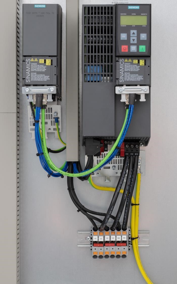 解决电机过热的方法是减小电机驱动电压中的高频成份。实现这个目的方法是在变频器的输出端安装SWF正弦波滤波器。正弦波滤波器将PWM电压波形变换成适应于电机的正弦波电压波形,如图2所示,从而消除了电机过热的现象。