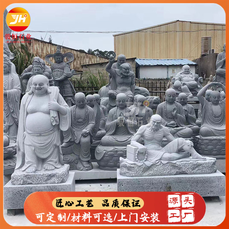 工艺师采用的石材多为花岗岩、青石或汉白玉,这些天然石材因其耐用性和质地均匀,成为了雕塑家们的选择。通过浮雕和圆雕技法,将罗汉的形象刻画得细致入微,无论是衣纹的飘逸还是面部表情的微妙变化,都显得生动自然。尤其是在处理光影和细节上,匠人们精湛的技艺使得每一尊罗汉像都具有震撼人心的力量。